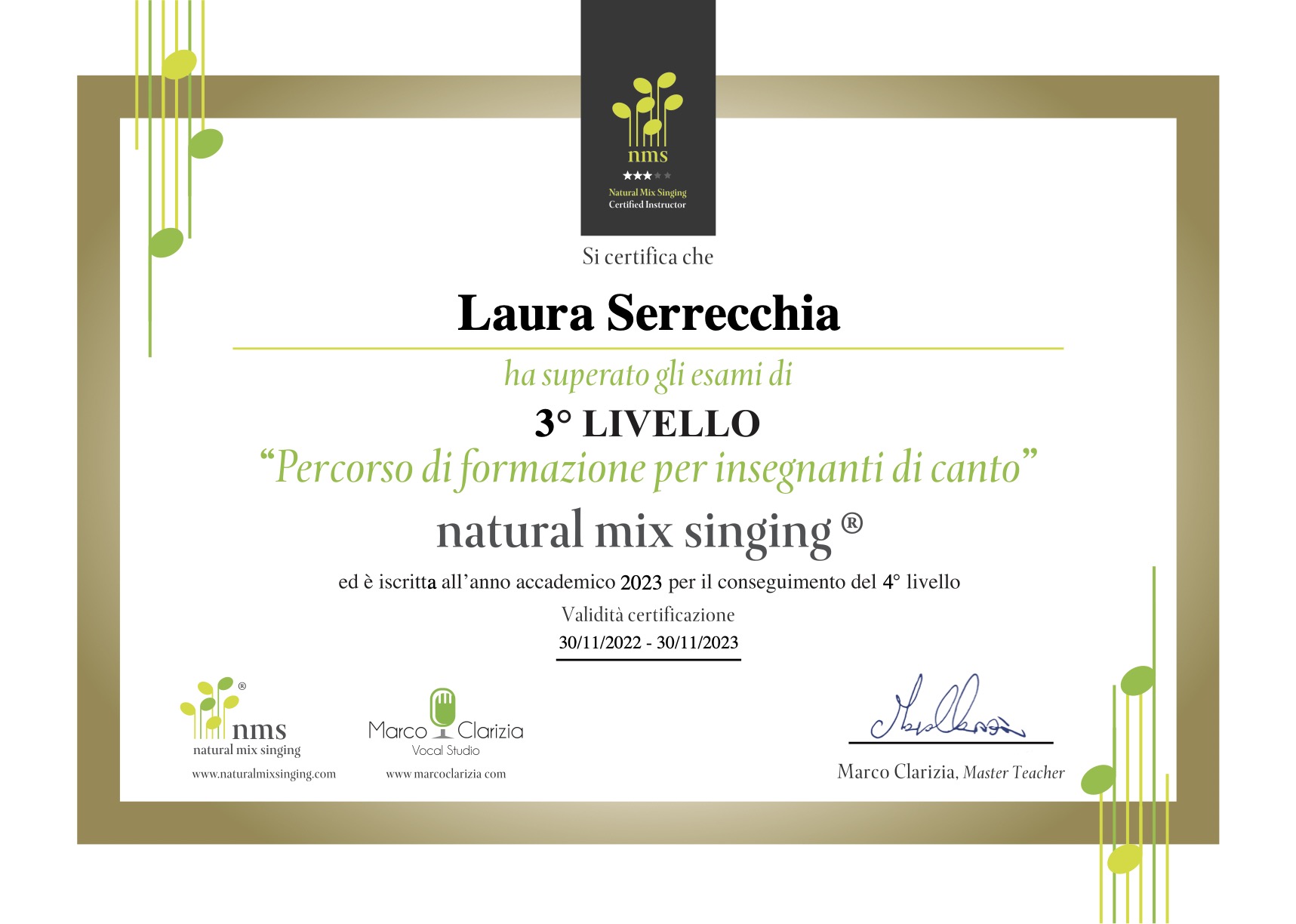 È insegnante di canto formata VOICEToTEACH®. È attualmente docente di Canto Moderno presso la scuola di musica Industrie Musicali/Modern Music Institute di Vallecrosia (IM) ed è docente certificata MVI